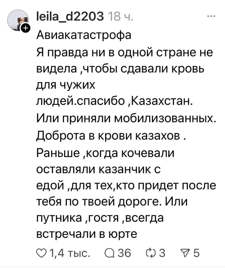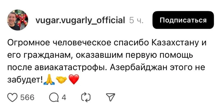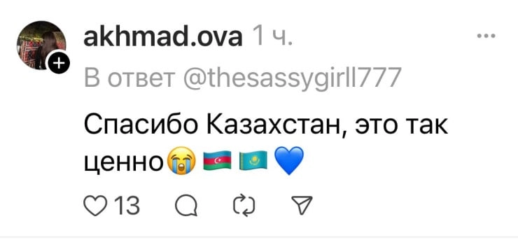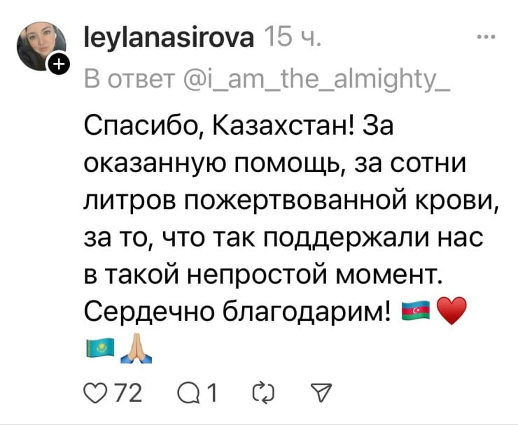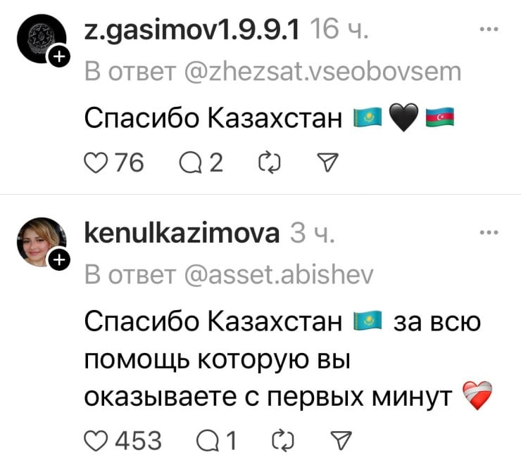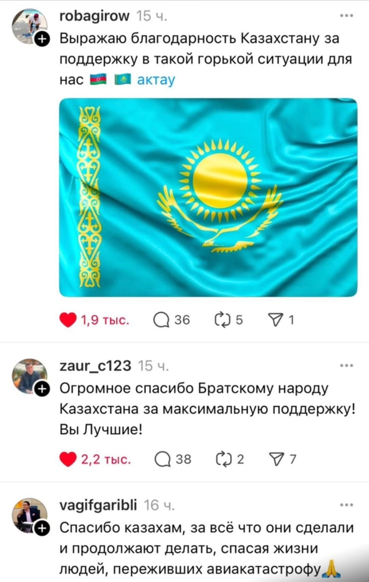После крушения самолета, которое случилось недалеко от Актау, азербайджанцы в социальных сетях не перестают благодарить народ Казахстана за помощь и поддержку. Tengri Life собрал их отклики на разных платформах.