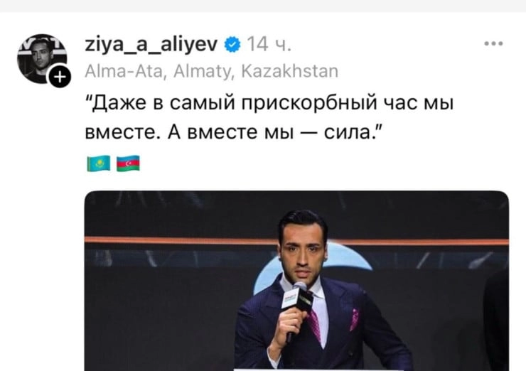 Известный промоутер Зия Алиев сопроводил трогательную цитату флагами Казахстана и Азербайджана.