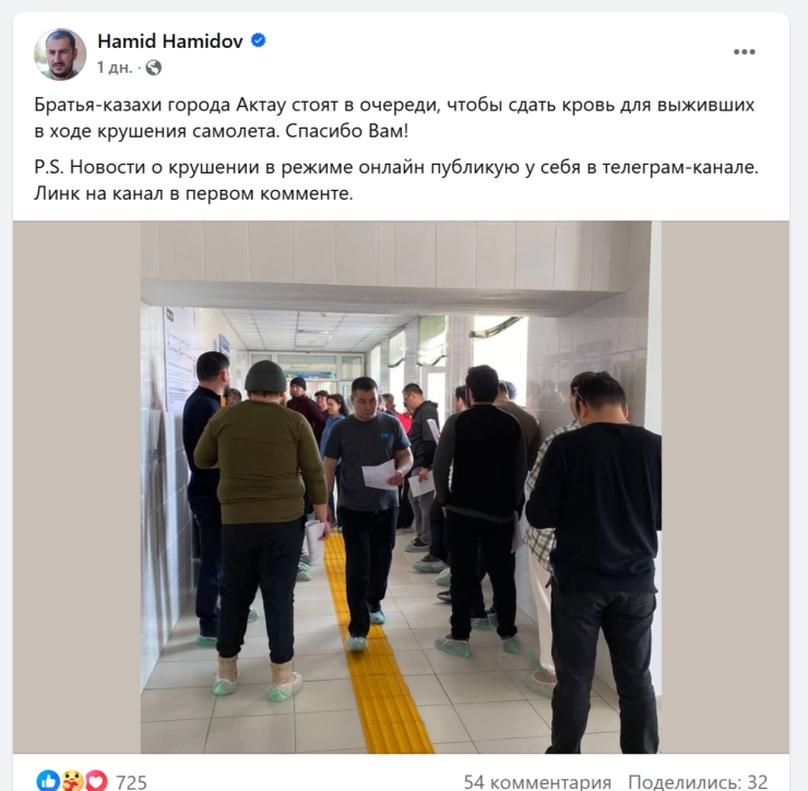 Блогер Гамид Гамидов в Facebook поблагодарил доноров, которые выстроились в очереди центре крови Актау для помощи пострадавшим. Он назвал казахстанцев братьями.