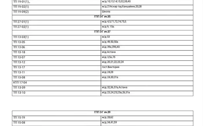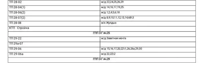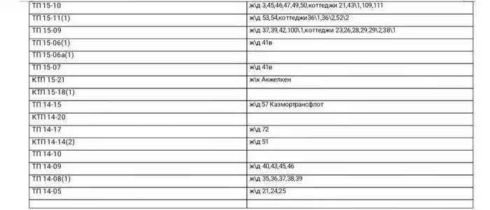 В ГКП «АУЭС» уточнили, что отключения будут частичными. Энергетики предоставили список домов и объектов, попадающих под плановые работы, с указанием подстанций. Например, подстанция ТП15-10 соответствует 15 микрорайону. Рядом с подстанцией перечислены дома, где временно не будет электричества.