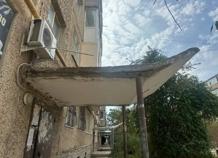 Жители дома в 11 микрорайоне Актау выражают серьезные опасения по поводу состояния бетонного козырька над подъездом. Каждый день они проходят под ним и боятся за свои жизни, так как конструкция выглядит крайне ненадежно.