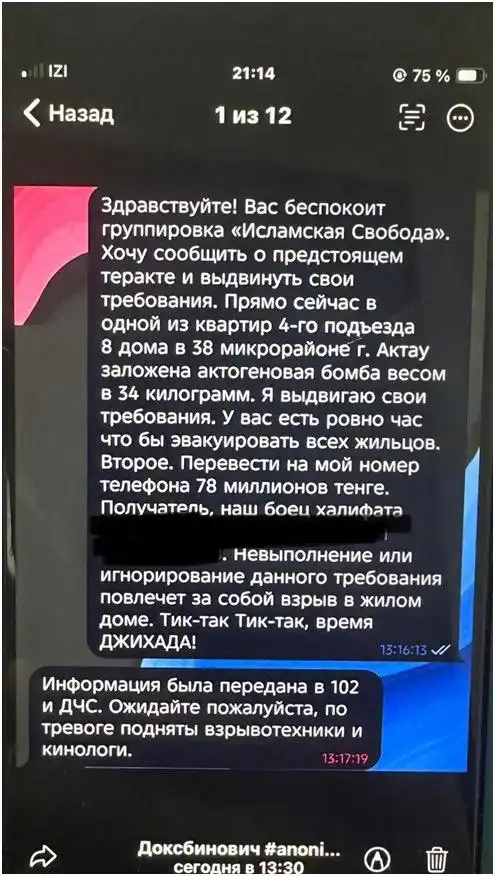 25 октября 2025 года на Telegram-канал «1414» поступило сообщение о наличии взрывного устройства в крупном торгово-развлекательном центре Актау. По данному факту возбудили уголовное дело по статье 273 (Заведомо ложное сообщение об акте терроризма) УК РК.