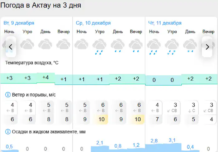 10 декабря в Актау прогнозируется дождь, температура днём — +2°C, ночью — +1°C.