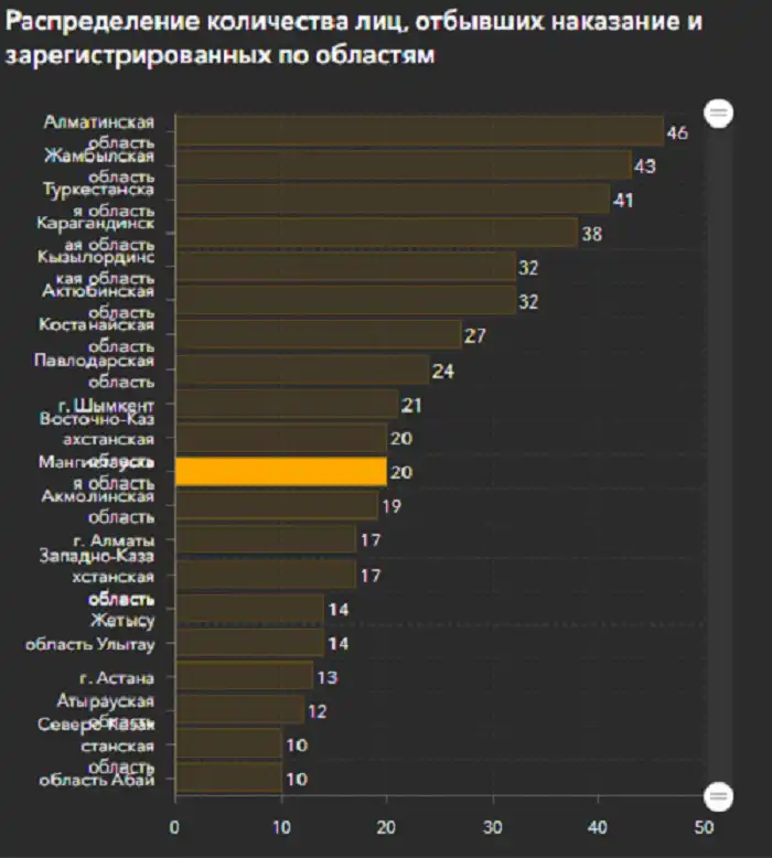 Согласно данным, в Мангистауской области проживает 20 человек, осуждённых за преступления против половой неприкосновенности детей. Распределение по городам и районам: