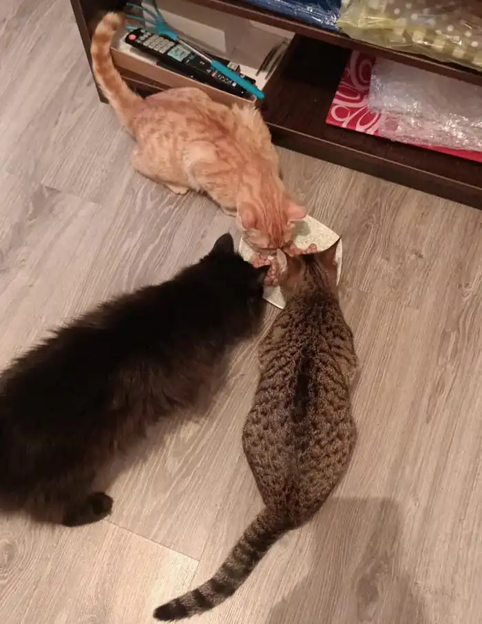 Котенок быстро освоился в новом доме: ему сразу показали лоток, и он без проблем стал им пользоваться. С другими животными Рыжик легко нашел общий язык и был принят в дружный коллектив, став частью семьи.