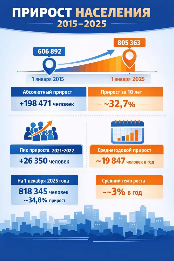 Наибольший прирост наблюдался в 2021 и 2022 годах, когда абсолютный прирост составил 26 350 человек или 3,66%. Это максимальный показатель за всё десятилетие как в абсолютных числах, так и в процентном соотношении.