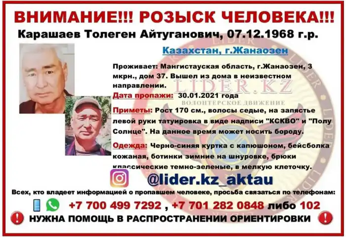 Год рождения: 1968Место проживания: ЖанаозенДата исчезновения: 30 января 2021 годаРост: около 170 см, волосы седые.Примечание: На левом запястье имеются татуировки с надписями «КСКВО» и изображением «полусолнца». В настоящее время может носить бороду.