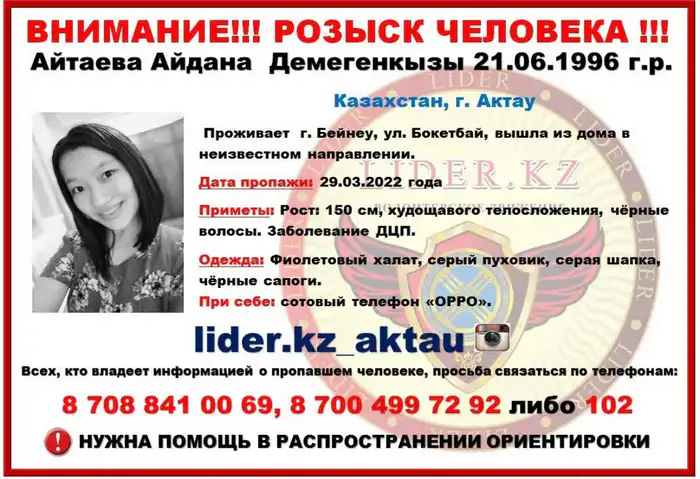 Год рождения: 1996Место проживания: село БейнеуДата исчезновения: 29 марта 2022 годаРост: около 150 см, худощавого телосложения, волосы чёрные.Примечание: Айдана страдает от ДЦП.