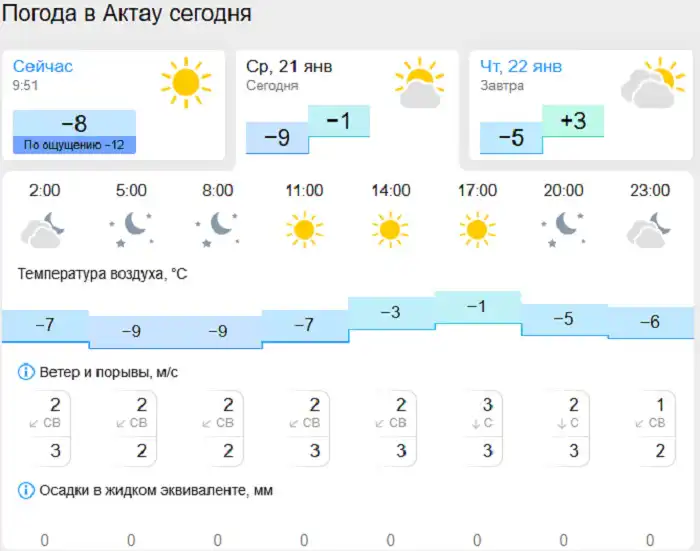 Согласно информации Gismeteo, в Актау ожидается солнечная погода. Днём температура воздуха составит −7 °C, ночью −6 °C. Ветер будет слабый, с порывами 2–3 м/с.
