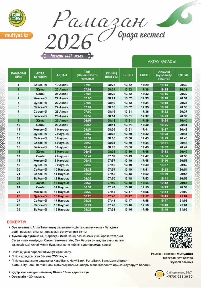 В 2026 году пост ораза начнется 19 февраля и продлится 29 дней, завершаясь праздником Ораза айт 20 марта. В первый день поста в Актау ауызашар состоится в 19:14, а священная ночь предопределения будет с 16 на 17 марта.