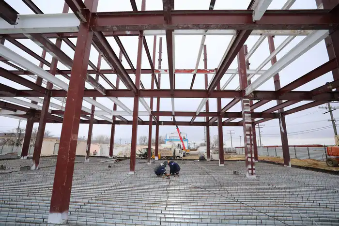 На данный момент возведение каркаса здания, монтаж стен и перекрытий выполнено на 63 %, а прокладка наружных инженерных сетей - на 50 %.