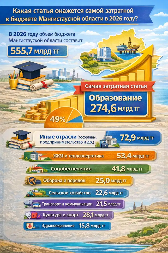 По данным администрации, объем бюджета Мангистауской области на 2026 год утвержден в размере 555,7 млрд тенге. Самой затратной статьёй является образование — на него выделено 274,6 млрд тенге, что составляет почти половину всего бюджета.