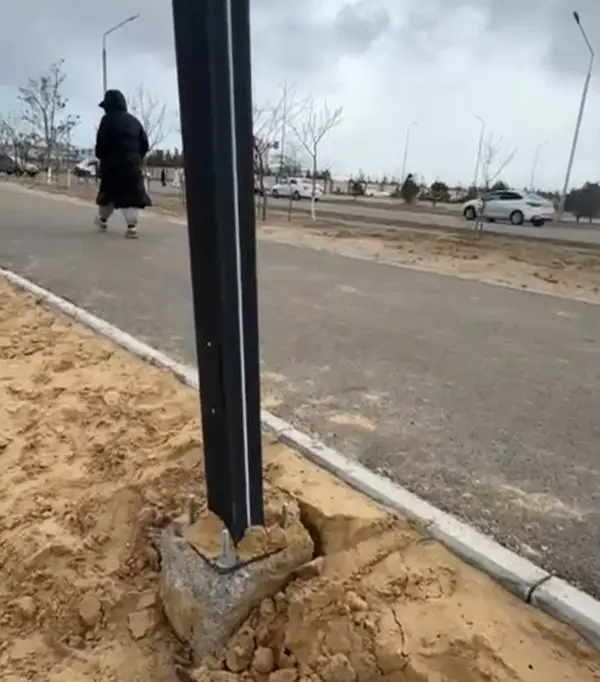 Жители также обратили внимание на опоры освещения вдоль пешеходных зон. По их утверждению, некоторые столбы выглядят неровно, а бетонное основание кажется небольшим и частично засыпано песком.