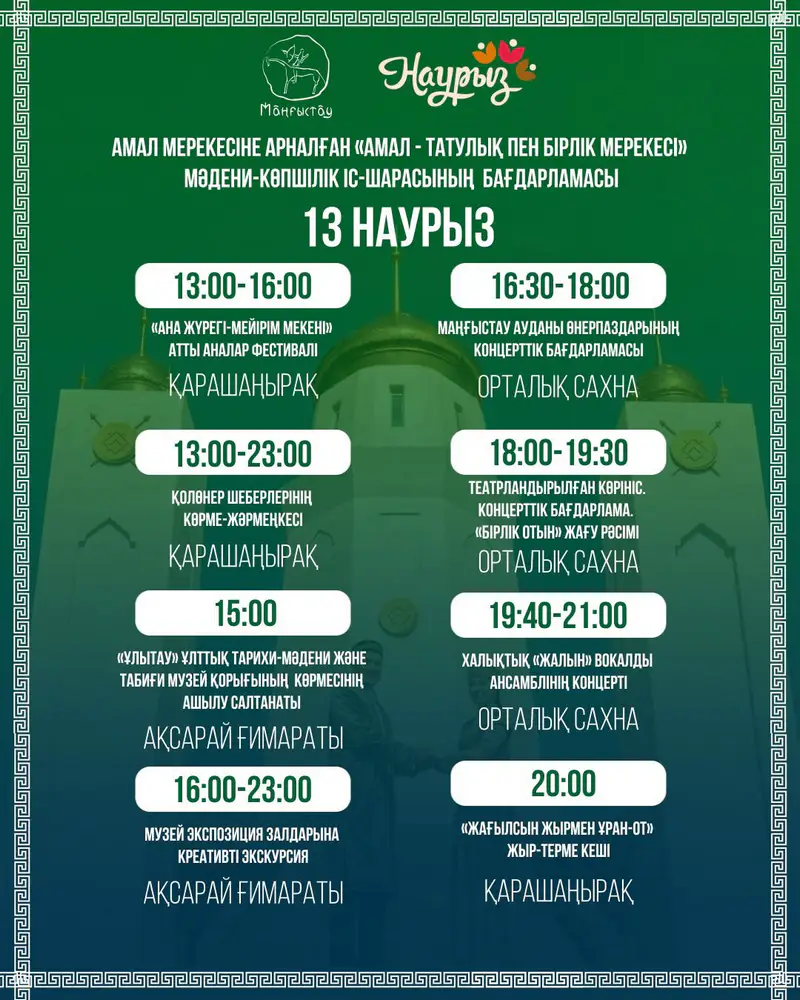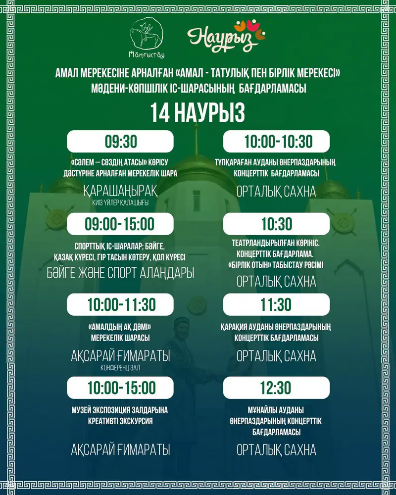 Кроме того, с 10:00 до 11:30 в конференц-зале здания «Ақсарай» пройдёт праздничное мероприятие «Амалдың ақ дәмі», посвящённое традиционным угощениям праздника.