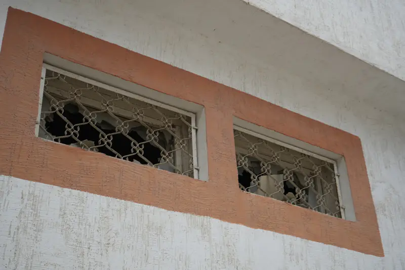 Некоторые окна в здании разбиты, что добавляет к общей картине запустения.