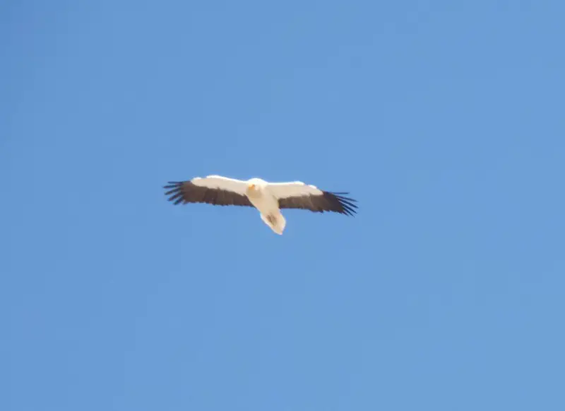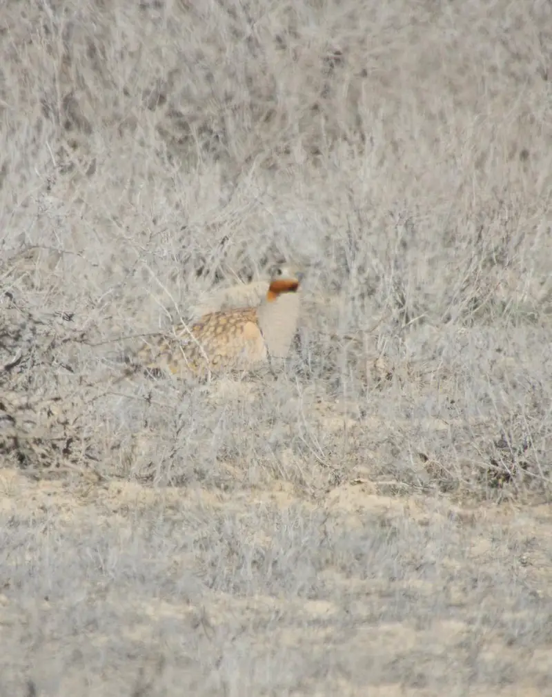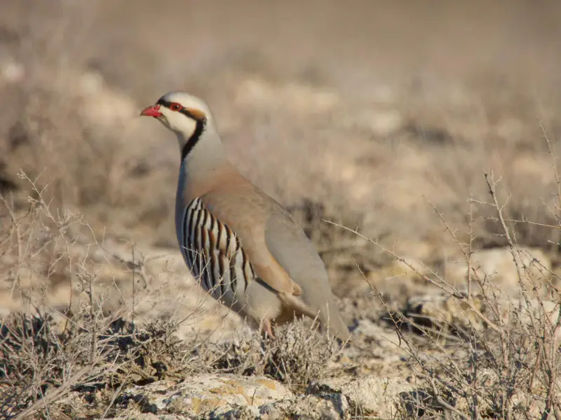 Куропатка, также обладающая высокой осторожностью, спряталась среди травы и кустарников. Благодаря своему защитному окраску, она становится почти незаметной в окружающей среде. Каменная куропатка, или кеклик, легко распознается по серому цвету тела, черной «маске» с полосой через глаза, красному клюву и полосатым бокам. Этот вид прекрасно адаптирован к жизни в каменистых и засушливых районах, быстро передвигаясь по земле и поднимаясь в воздух лишь в случае крайней необходимости.