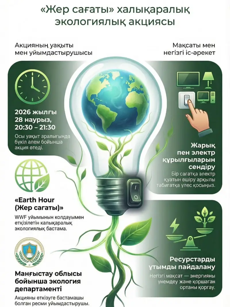 В Мангистауской области пройдет международная экологическая акция «Час Земли» («Earth Hour»), организуемая при поддержке Всемирного фонда природы (WWF). Мероприятие состоится 25 марта с 20:30 до 21:30 по местному времени.