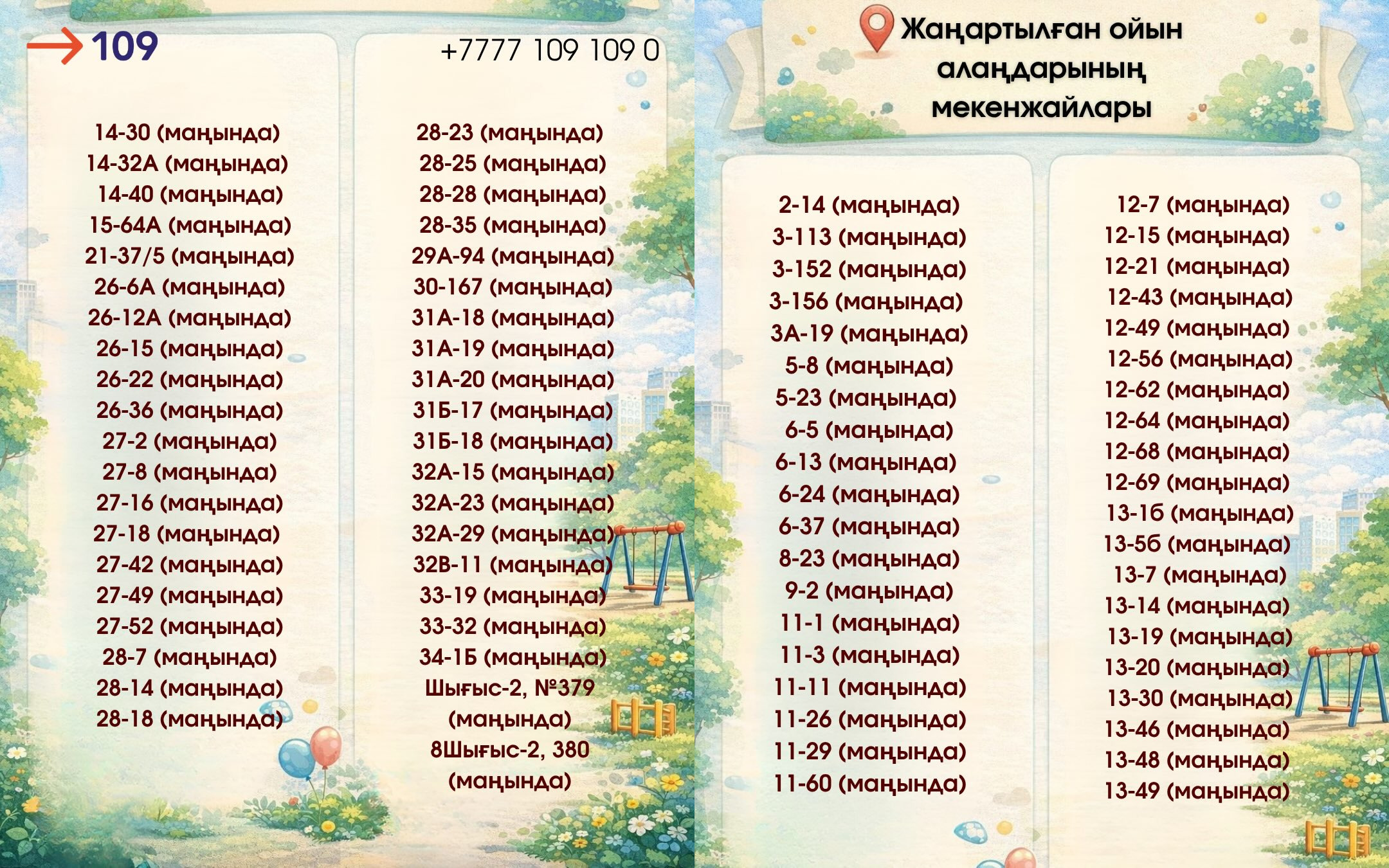 В рамках обновления планируется установка 80 новых детских игровых площадок и 50 спортивных площадок взамен изношенных. Конкурс на выполнение работ выиграло ТОО «Болашак-Өзень», и администрация уже сформировала перечень мест, где будут проводиться обновления.