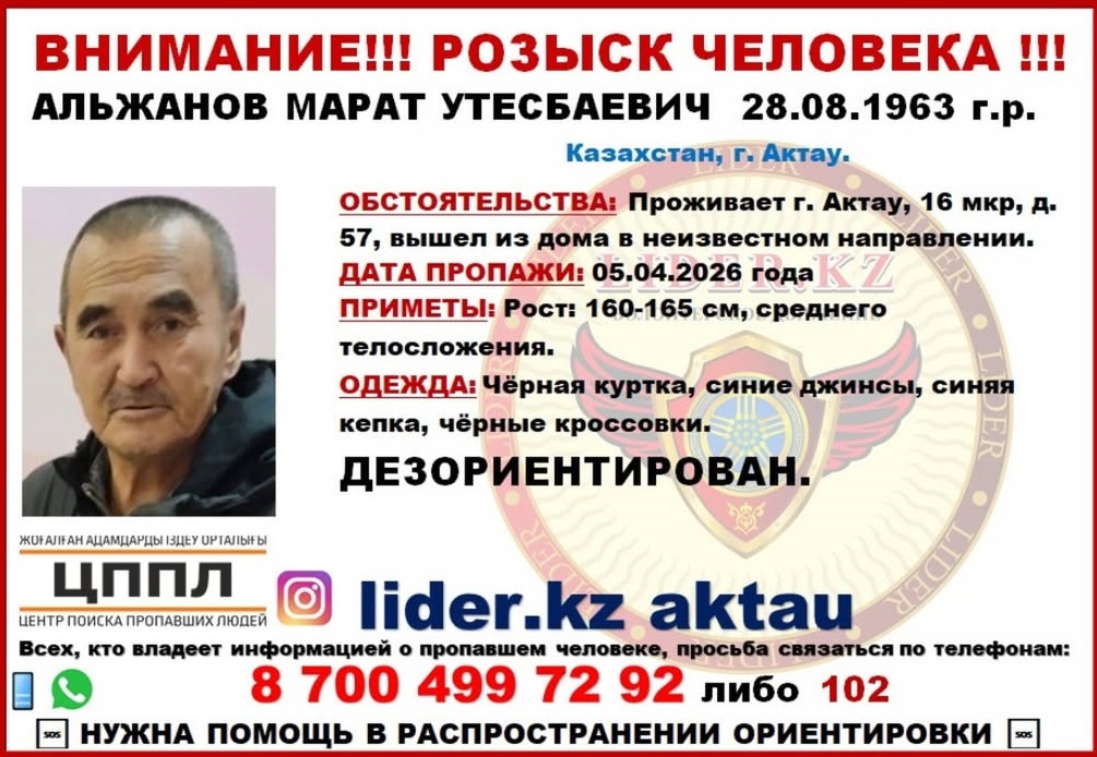 В Актау разыскивают мужчину, пропавшего 5 апреля. Он дезориентирован, рост 160-165 см, среднего телосложения, в чёрной куртке и синей кепке. Информацию о местонахождении просят сообщить по телефонам: +7 (700) 499-72-92 или 102.