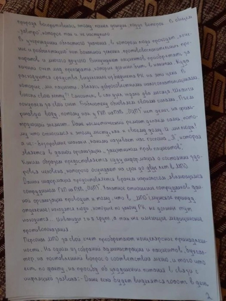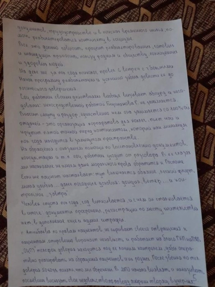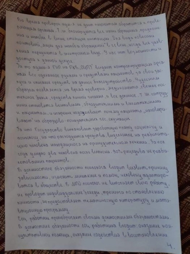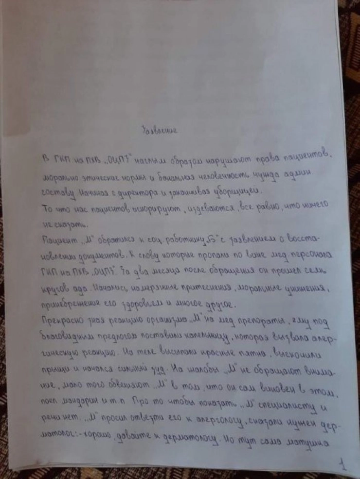 Пациент М. обратился к социальному работнику Б. с заявлением о восстановлении документов, которые, к слову, пропали по вине медперсонала центра здоровья. За два месяца после обращения он прошел семь кругов ада. Начались намеренные притеснения, моральные унижения, пренебрежение его здоровьем и многое другое. Прекрасно зная реакцию организма М. на медпрепарат, ему под благовидным предлогом поставили капельницу, которая вызвала аллергическую реакцию. На теле высыпали красные пятна", – говорится в заявлении пациентов.