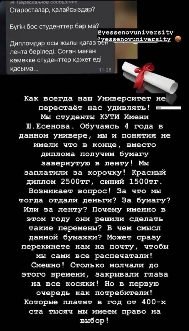"Как всегда, наш университет не перестает нас удивлять! Мы студенты КГУТИ имени Ш. Есеноватете, мы и понятия не имели, что в конце вместо диплома получим бумагу, завернутую в ленту! Мы заплатили за корочку! Красный диплом - 2500 тенге, синий - 1500 тенге. Возникает вопрос: за что мы тогда отдали деньги? За бумагу? Или за ленту? Почему именно в этом году они решили сделать такие перемены? В чем смысл данной бумажки? Может, сразу перекинете нам на почту, чтобы мы сами все распечатали? Смешно! Столько молчали до этого времени, закрывали глаза на все косяки! Но в первую очередь как потребители, которые платят в год от 400 тысяч, мы имеем право на выбор!", - пожаловались студенты в соцсетях.