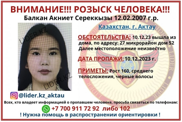 Известно, что Акниет Балкан вышла из дома (по адресу 27 микрорайон 52 дом) 10 декабря и до сих пор не вернулась. По данным правоохранительных органов, Акниет среднего телосложения, рост 160 сантиметров, волосы черные.