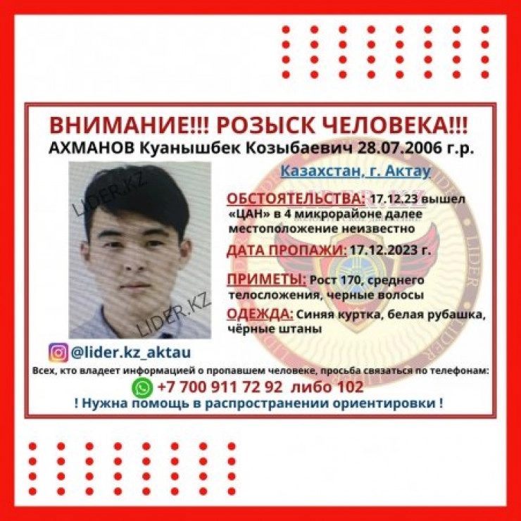 Последний пропавший Куанышбек Ахманов - 2006 года рождения, 17 декабря вышел из "ЦАН" в 4 микрорайоне. Рост 170 сантиметров, среднего телосложения, волосы черные. На нем были синяя куртка, белая рубашка и черные штаны.