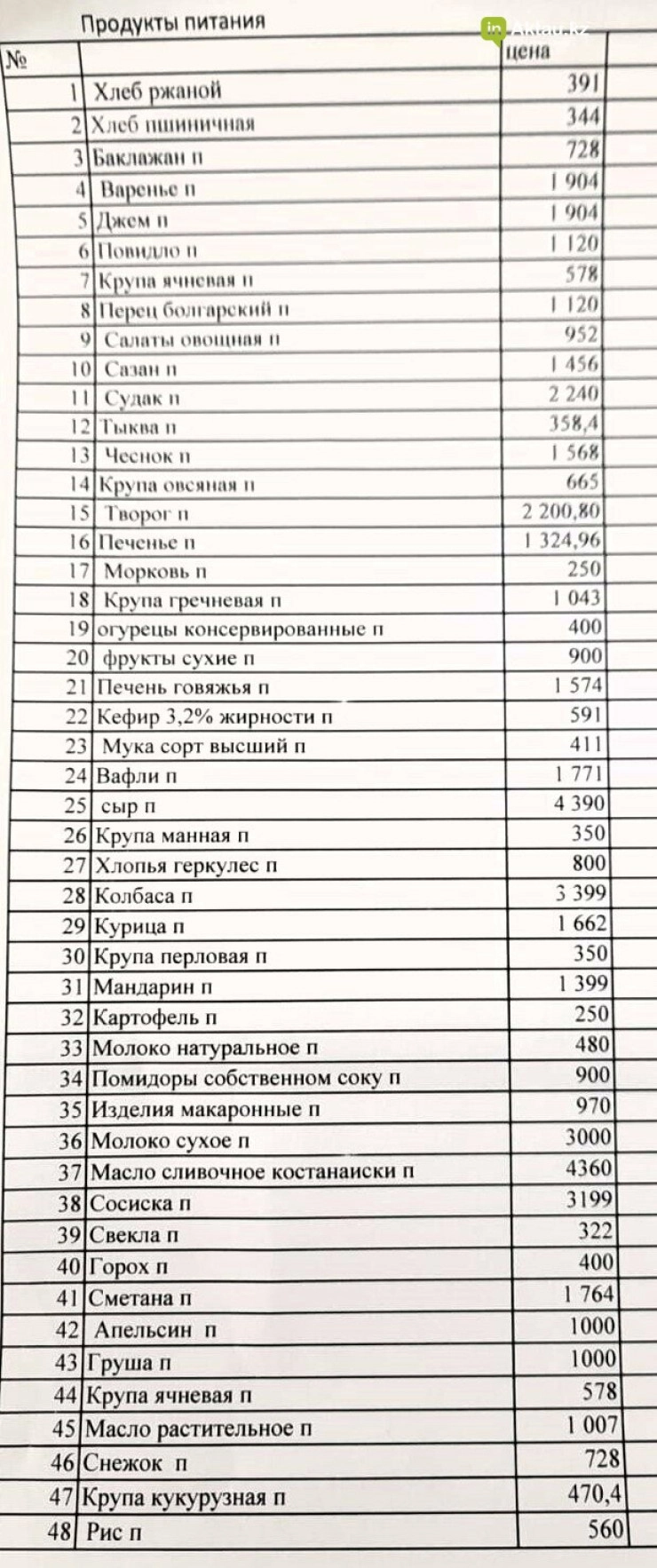 Судя по прайсам, которые предоставили родителям, цены на продукты выше, чем в минимаркетах с накруткой, сообщает портал. Для примера, у поставщика этого детского сада одна булка белого хлеба стоит 344 тенге, а один килограмм макарон 970 тенге. Завышена стоимость также мяса птицы, круп, чая, сливочного масла, фруктов и овощей.