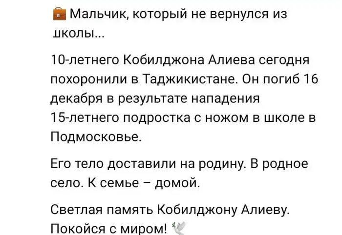 Убийство 10-летнего Кобилджона Алиева в подмосковной школе вызвало широкий общественный резонанс и активные обсуждения в социальных сетях, где пользователи выражают поддержку семье погибшего и требуют справедливости.
