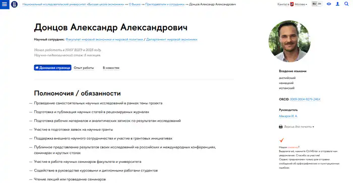 На сайте НИУ ВШЭ указано, что Александр Донцов действительно работает там уже пять месяцев в качестве научного сотрудника факультета мировой экономики и мировой политики.