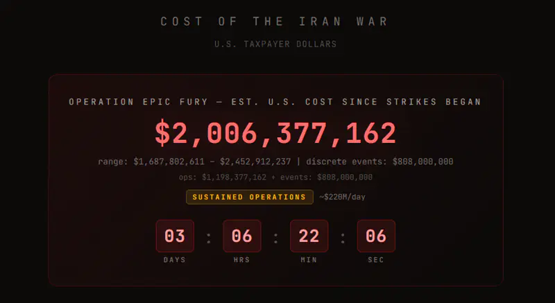 С начала военного конфликта в сети появился сайт Cost of the Iran War, который подсчитывает расходы на операцию США против Ирана, сумма затрат на 3 марта превысила 2 миллиарда долларов.