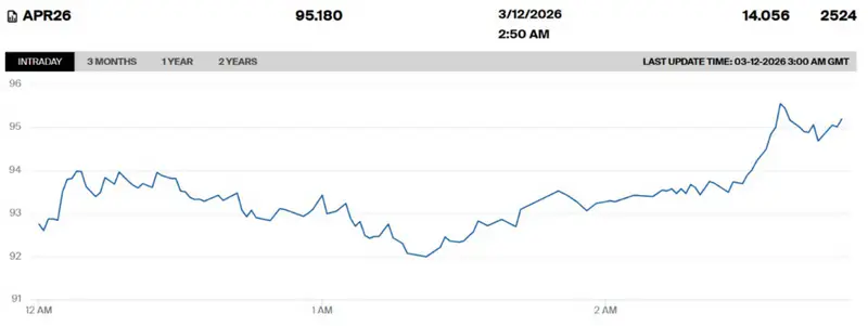 Апрельские фьючерсы на нефть марки WTI также показали рост на 14,06 процента, достигнув 95,18 доллара за баррель.