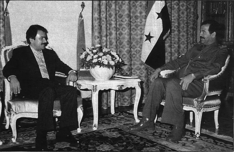 Саддам Хусейн (справа) и Масуд Раджави, лидер Организации народных моджахедов Ирана, 1987 год. Фото является общественным достоянием